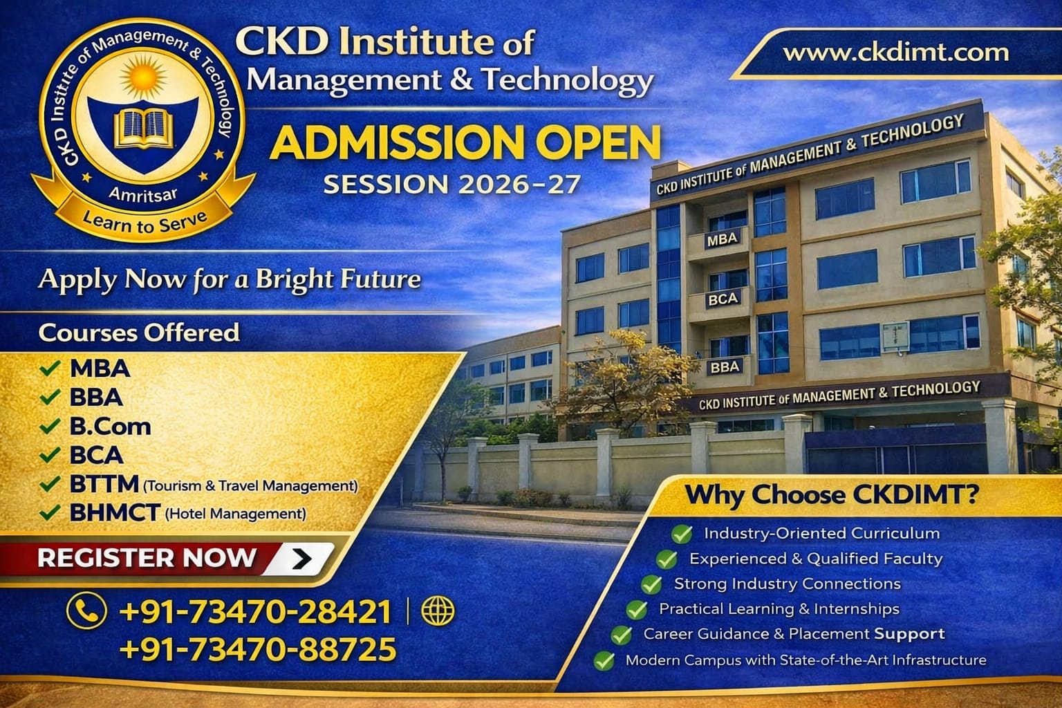 It is my profound privilege and great pleasure to introduce ourselves, the CKD Institute of Management & Technology (CKDIMT), Amritsar, set up with the mission to impart affordable quality education and produce qualified.
